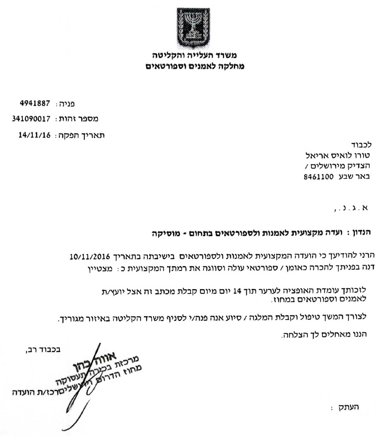 It is accredited by the Ministry of Alia and Absorption. Receives award as an artist of excellence by Israel Music Center in Jerusalem.>see<